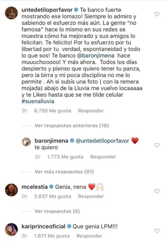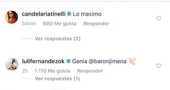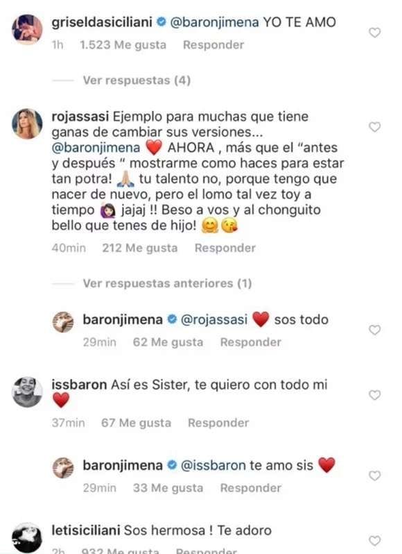 Tras su descargo, en el que acepta las cirugías plásticas que se hizo, muchas colegas le enviaron mensajes apoyando su iniciativa, como Natalie Pérez, Sabrina Rojas, Celeste Cid, Griselda Siciliani, Cande Tinelli, la Princesita Karina, Malena Narvay, Leticia Siciliani y Luli Fernández.