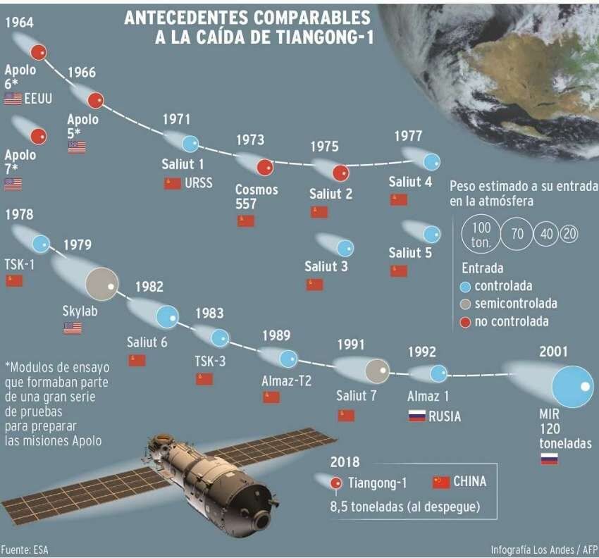 Los expertos explicaron que no hay que preocuparse por que el Tiangong-1 pueda causar daños cuando regrese a la Tierra. La ESA señaló que en los últimos 60 años hubo casi 6.000 entradas de grandes objetos en la atmósfera que no provocaron daños ni víctimas.