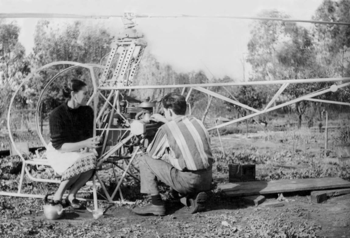 El primer helicóptero artesanal apenas levantó unos centímetros del suelo. Pero lo mejoró con más potencia en el motor y aquella maravilla hecha de rezagos ¡funcionó!