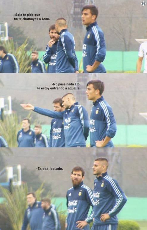 En esta ocasión, se viralizó en Twitter y Facebook una "conversación" entre Leo Messi y el atacante del Inter. En la edición de humor de unas fotos durante el entrenamiento en Ezeiza, el crack del Barcelona "le pide" al ex Sampdoria que no se meta con su mujer. La respuesta no tiene desperdicio.