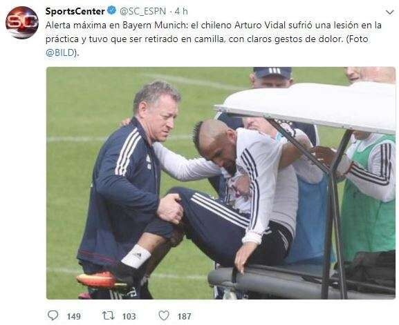 "Alerta máxima en Bayern Munich: el chileno Arturo Vidal sufrió una lesión en la práctica y tuvo que ser retirado en camilla, con claros gestos de dolor", publicó SportCenter (ESPN).