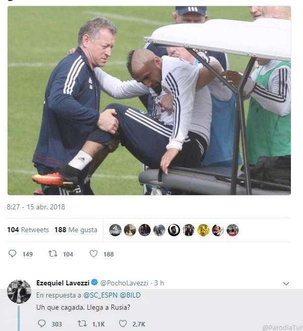 El futbolista argentino Ezequiel Lavezzi realizó un polémico comentario en Twitter cargando al chileno Arturo Vidal, quien se lesionó en un entrenamiento del Bayern Munich y se perderá el resto de la temporada.