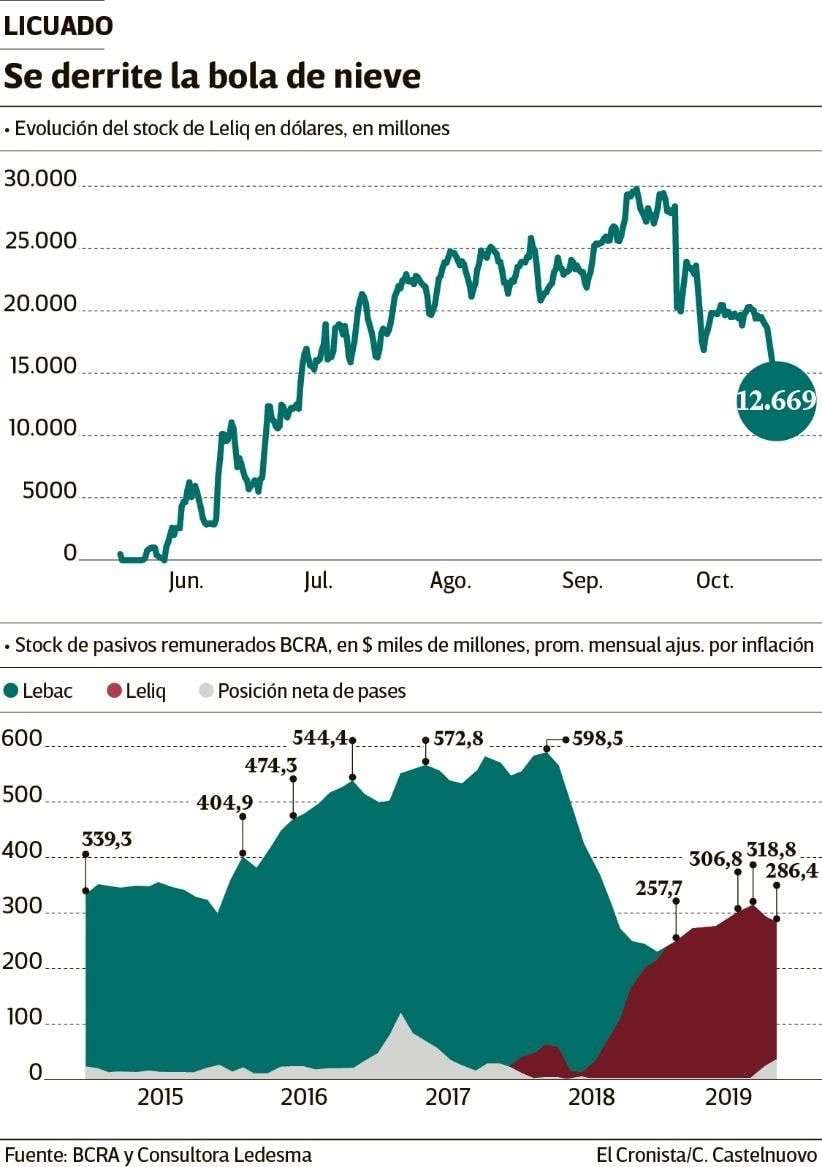 En el punto de máximo el stock de Leliq llegó a $ 1,3 billón, mientras que hoy está en $ 750.000 millones. Medido en dólares, antes de las PASO el saldo de letras sumaba u$s 28.387 millones mientras que al tipo de cambio actual representa u$s 12.669 millones. "El salto del dólar implicó que las Leliq dejaran de ser un problema y que estabilizar a la divisa (algo un poco más urgente y preocupante) se convirtiera en el objetivo central", señaló Matías Rajnerman, de Ecolatina.
