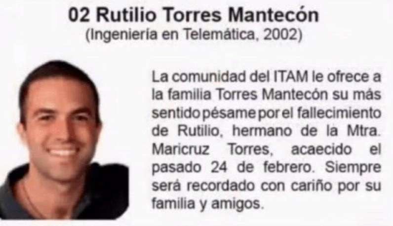 “La comunidad de ITAM le ofrece a la familia Torres Mantecón su más sentido pésame por el fallecimiento de Rutilio, hermano de la Mtra Maricruz Torres, acaecido el pasado 24 de febrero”, rezaba el texto.