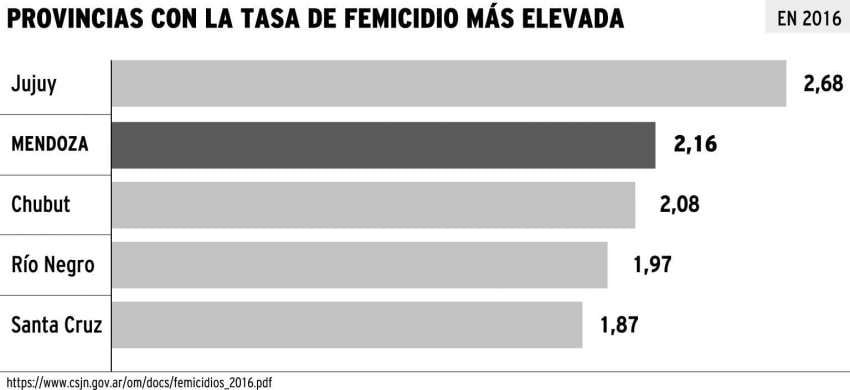 Para la Corte Suprema de Justicia de la Nación, a través del Registro Nacional de Femicidios, durante el año 2016 (el trabajo de 2017 aún no está terminado) Mendoza es la tercera provincia con más casos de femicidio (21), superada sólo por Buenos Aires (90) y Córdoba (23). Los datos corresponden a las causas que fueron judicializadas.