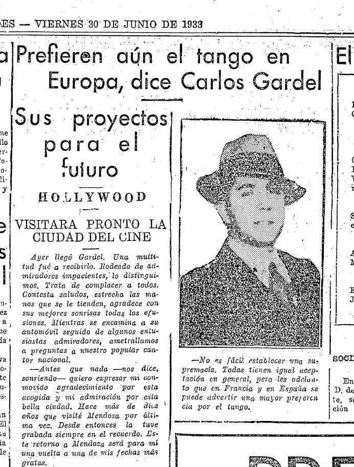 "Prefieren aún el tango en Europa, dice Carlos Gardel", fue el título de la nota de la edición de Los Andes del día viernes 30 de junio de 1933 en su página 8.Veamos cómo fue esa breve charla que dio pie a este invalorable documento: