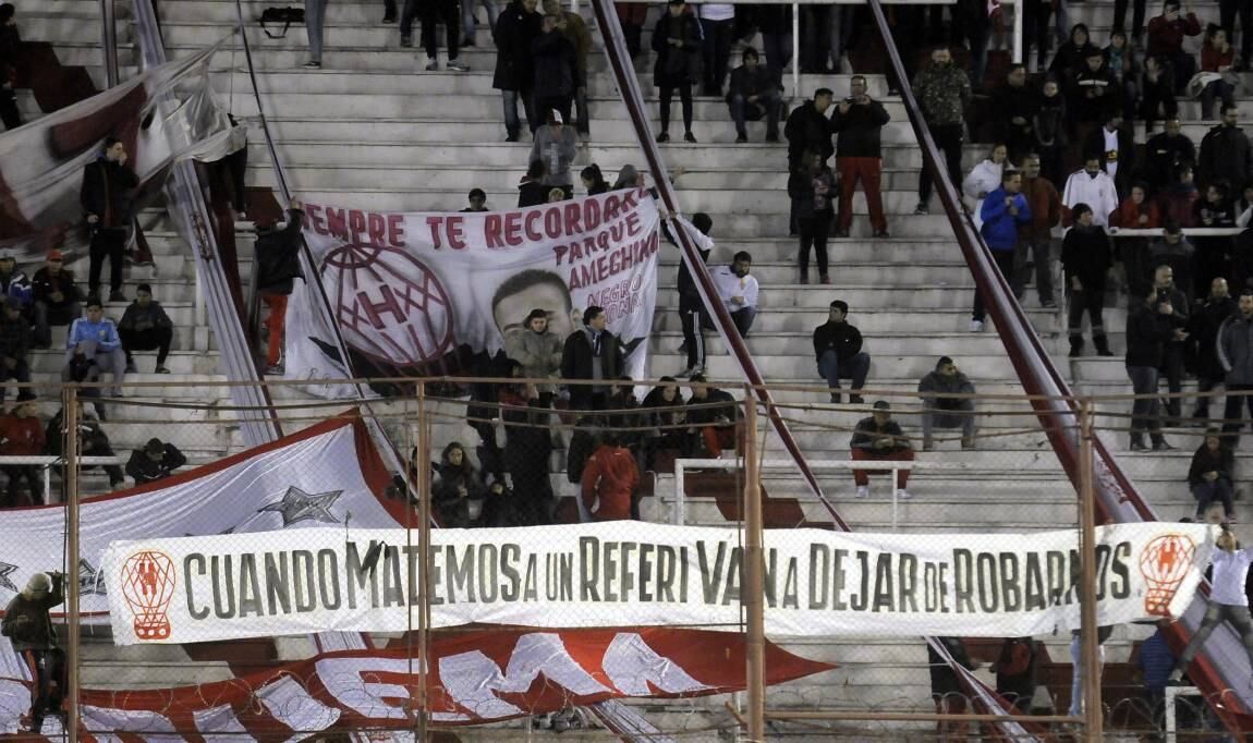 "Cuando matemos a un referí van a dejar de robarnos", decía la bandera blanca con letras negras que fue atada en el alambrado que da a la tribuna popular de Huracán, en el estadio Tomás Adolfo Ducó.