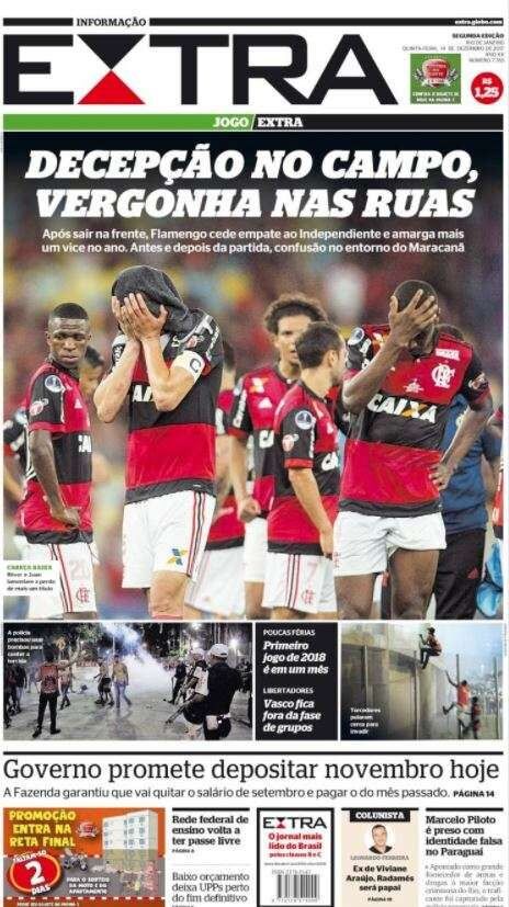 Así reflejan los diarios de Brasil la final perdida por Flamengo ante Independiente, en la Copa Sudamericana. "No es cierto", tituló el deportivo Lance. "Vergüenza", apuntó el diario Extra.