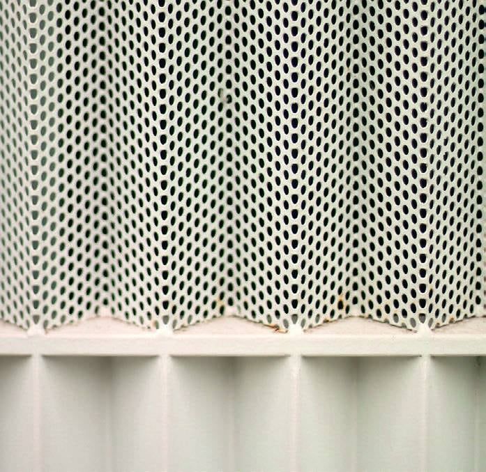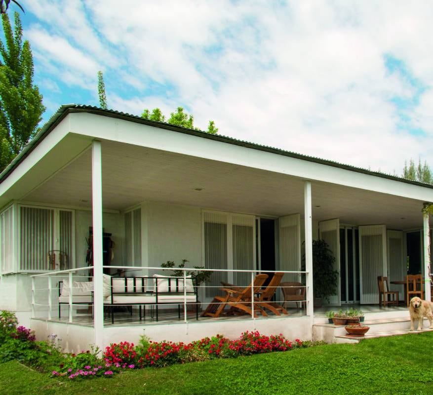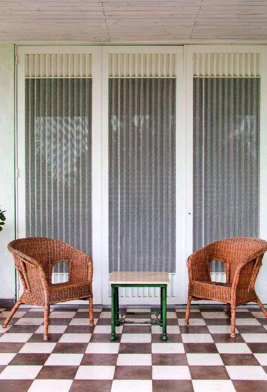 Otro elemento clave en el diseño y la eficiencia térmica de la casa son las celosías. Para tener rejas por seguridad y celosías para ventilar se diseñó un elemento que cumpliera con los dos requisitos. Las celosías son metálicas de chapa perforada. Se puede ventilar por la proporción de las perforaciones de la chapa y funcionan como “screen” dejando ver a contraluz y manejando el asoleamiento directo de los espacios sin necesidad de cortinas.