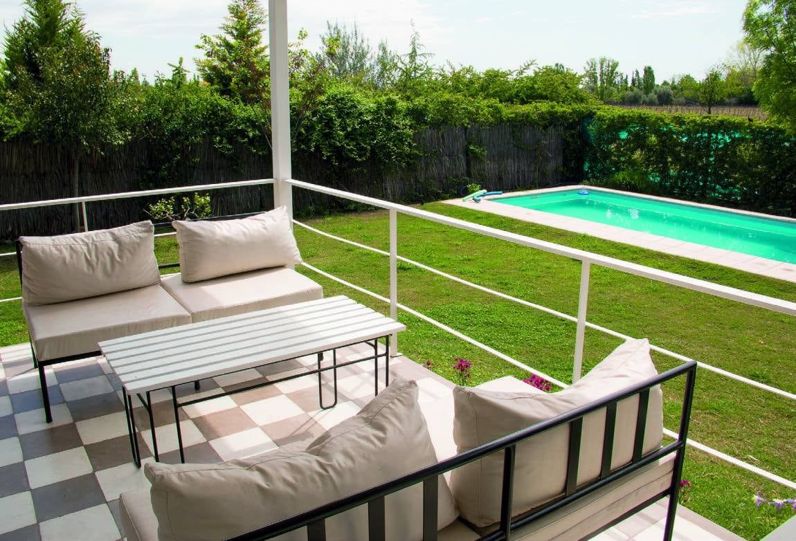 El estar comedor principal se abre a la galería, ambos del mismo tamaño. La idea es duplicar la posibilidad de uso y poder tener la misma cantidad de espacio para recibir gente dentro y fuera de la casa. La galería está elevada y abre la vista hacia la finca. El estudio en la proa de la casa, es propicio para trabajar apreciando la pileta y la viña de la finca.