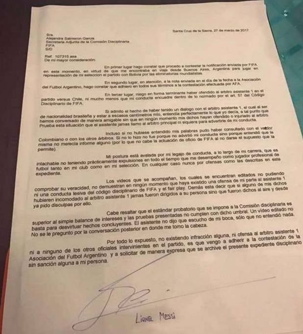 "Niego en forma terminante haber ofendido al árbitro asistente 1 en el partido versus Chile, ni mucho menos que mi conducta encuadre dentro de lo normado por el art. 57 del Código Disciplinario de FIFA", expresó el futbolista de la Selección.