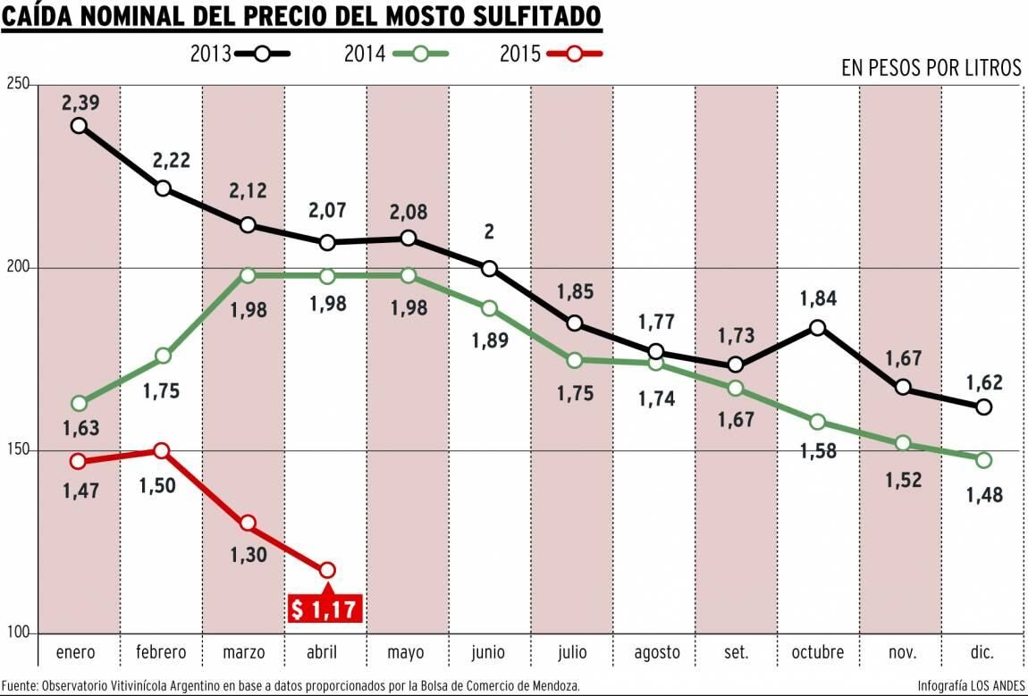 El mosto sulfitado, el cual históricamente acompaña la tendencia del precio del vino, también lleva varios meses de caída. Así las cosas, según el Observatorio, el promedio en precios nominales de esta caída es apenas 3,4%, pero si comparamos el precio de marzo de 2014 con el de 2015, la caída llega 34%. Mientras que si se suma el impacto de la inflación, en términos reales, la caída supera el 65%.