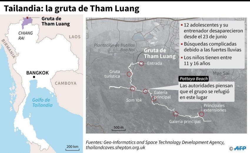 Los amplios esfuerzos de rescate se vieron dificultados por las fuertes lluvias, que inundaron la cueva de Tham Luang, situada en el norte de Tailandia y bloquearon el acceso a las cámaras donde se esperaba encontrar al grupo.