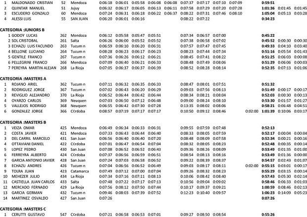 En el resto de las categorías los ganadores fueron, Ariel Rojano (Master A) donde ya es virtual campeón el tucumano Jorge Rodríguez, Gustavo Cerutti (Master C), José Nascimbene (Master D), Luciano Robledo (Principiantes A) y Ezequiel Ovejero (Principiantes B).
