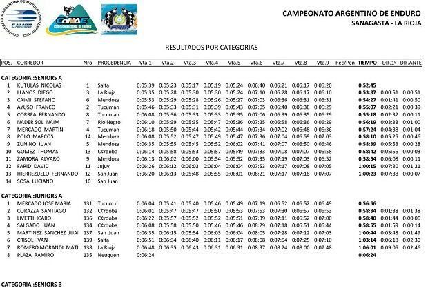 Es que Stéfano Caimi se quedó con la tercera posición en la máxima categoría que fue ganada por el salteño Nicolás Kútulas (Husqvarna Lelli-Factory Race-Radikal Racing), quien con este resultado prácticamente selló su bicampeonato nacional, ya que si bien logró reunir la diferencia necesaria en lo matemático, todavía deberá cumplir con la formalidad de largar la última fecha del torneo para poder realizar el descarte de fecha previsto en el reglamento y oficializar su coronación 2018. Segundo fue Diego Llanos (Beta Argentina Mezher-Factory Race-Radikal Racing). El mendocino Stéfano Caimi (KTM-Arter Mousses) quedó en tercer puesto a 1’41” del ganador, continuando por buena senda su regreso al enduro nacional tras incursionar brevemente en el Rally Raid.