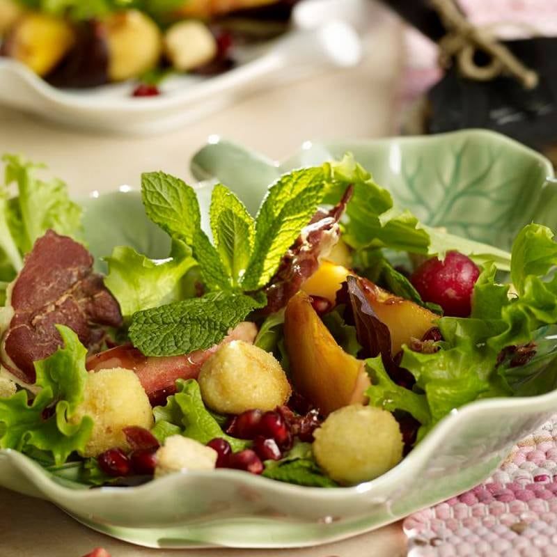 6. Para servirlo, poner un fondo de lechuga, hierbabuena y perejil fresco. Cubrirlo con el jamón y el queso. Laminar los rabanitos. Regarlo con la vinagreta y adornarlo con la granada.