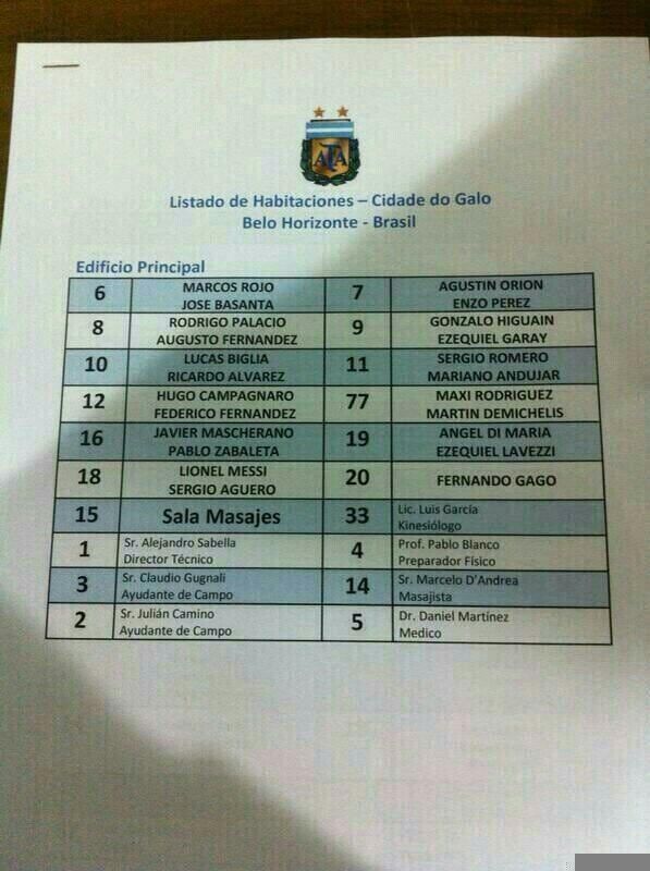 El plantel completo de la Selección argentina, que ya está en su búnker de Belo Horizonte a la espera del debut en la Copa del Mundo ante Bosnia, conoció hace instantes la disposición de las habitaciones en el complejo Cidade Do Galo, del Atlético Mineiro. Lionel Messi y Sergio Agüero compartirán dormitorio, mientras que Fernando Gago dormirá solo. El mendocino Enzo Pérez compartirá el cuarto con Agustín Orión, arquero de Boca Juniors.