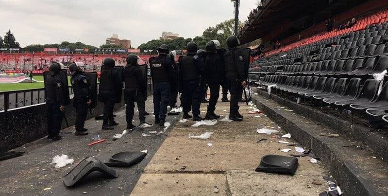 A continuación la policía empezó a reprimir con balas de goma sobre el sector sudoeste de la tribuna local para desalojar al público presente y también en la platea baja, donde hubo butacas destrozadas y enfrentamientos con los uniformados.