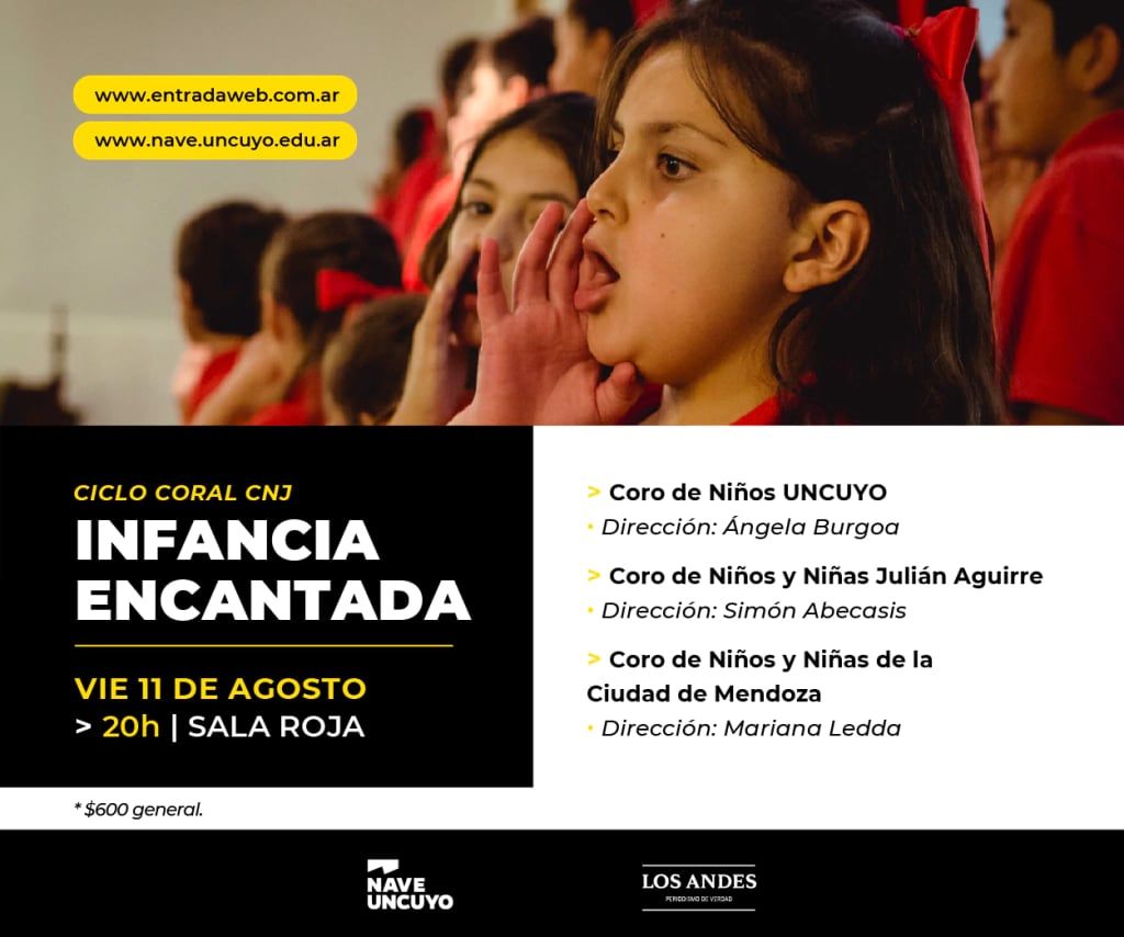 En la Sala Roja de la Nave UNCuyo. Se presentan el Coro de Niños de la UNCuyo, dirigido por Ángela Burgoa; el Coro de Niños y Niñas Julián Aguirre, dirigido por Simón Abecasis y el Coro de Niños y Niñas de la Ciudad de Mendoza, dirigido por Mariana Ledda.
