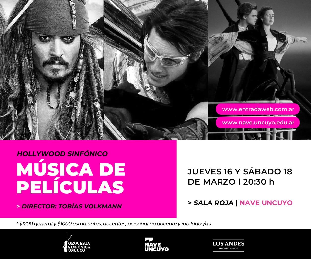 Desde la Orquesta Sinfónica se informa que el concierto de Música de Películas que se iba a realizar el jueves 16 y sábado 18 de marzo en la Nave UNCuyo se ha reprogramado para el jueves 23 y sábado 25 del corriente mes.