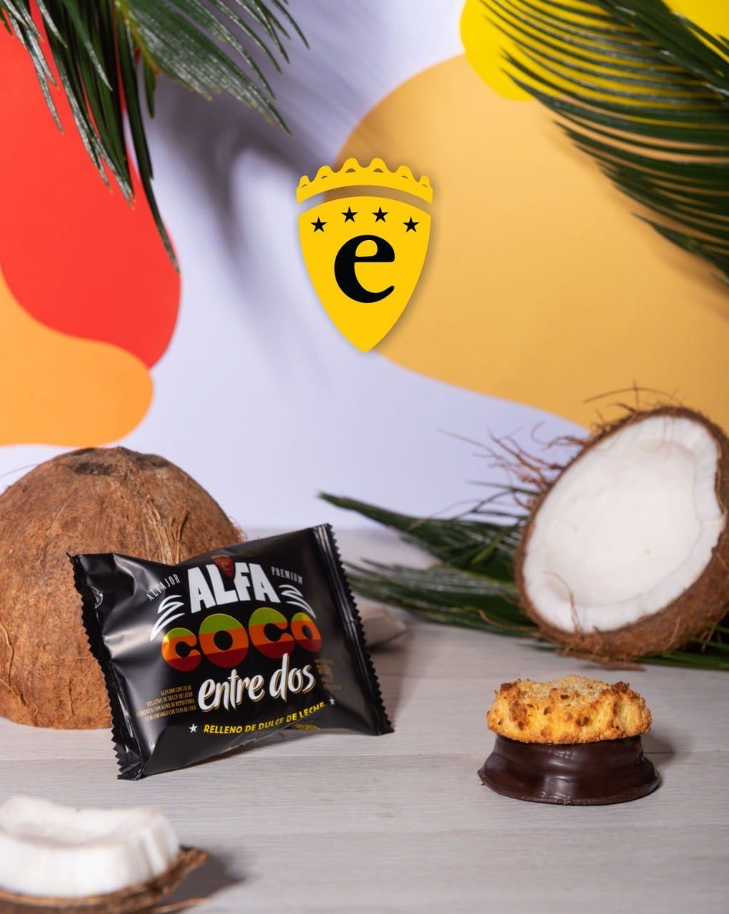 Alfacoco es una equilibrada mezcla de sabores, con su tapa de chocolate con dulce de leche y baño de chocolate con una cubierta de un exclusivo coquito Entre Dos, el cual se elabora manualmente utilizando la clásica técnica de la repostería, batido liviano de coco.