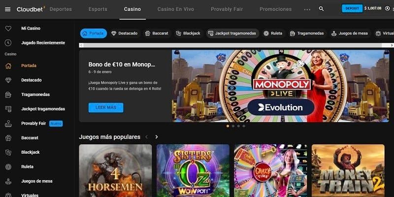 En Cloudbet podés encontrar un catálogo de juegos de más de 1200 en distintas categorías, donde los principales son las tragamonedas tradicionales y con jackpot, además de ruletas, juegos de mesa, blackjack, e incluso podés encontrar más de 20 tipos en apuestas deportivas.