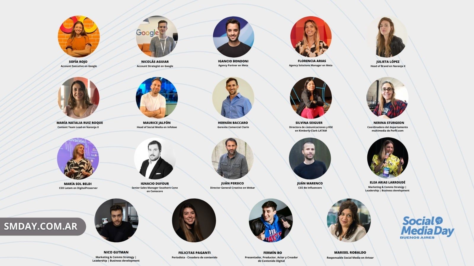 Esta edición de Social Media Day contará con la participación de los siguientes oradores: Sofía Rojo, Account Executive en Google; Nicolás Aguiar, Account Strategist en Google; Florencia Arias, Agency Solutions Manager en Meta; Ignacio Bondoni, Agency Partner en Meta; Juan Pérsico, Director General Creativo en Webar; Silvina Seiguer, Directora de Comunicaciones y Responsabilidad Social Corporativa para Latinoamérica en Kimberly-Clark; Juan Marenco, CEO Be Influencers; María Sol Beldi, CEO Latam en DigitalProserver; Ignacio Dufour, Senior Sales Manager Southern Cone en Comscore; Julieta López, Head of Marketing en Naranja X y María Natalia Ruiz Roque, Content team lead en Naranja X.