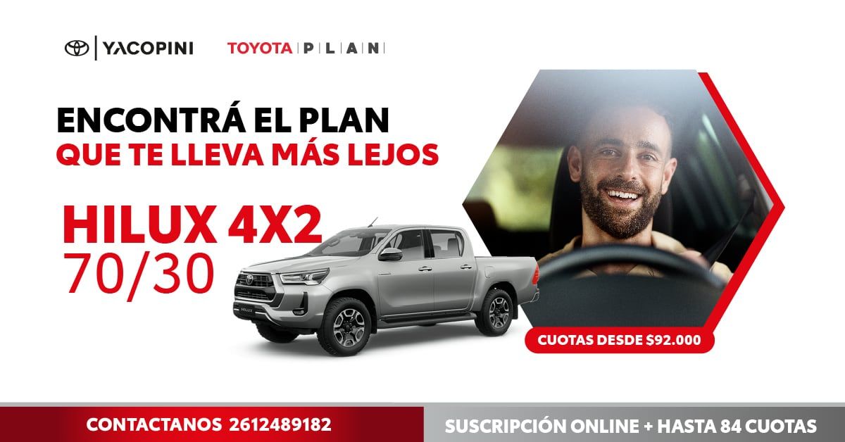 Pasando ya a la línea Hilux, en el caso de la Toyota Hilux 4x2, podés acceder al plan 70/30 con la cuota 1 desde $95.560, mientras que la Toyota Hilux 4x4 100% con cuota 1 desde $136.863.