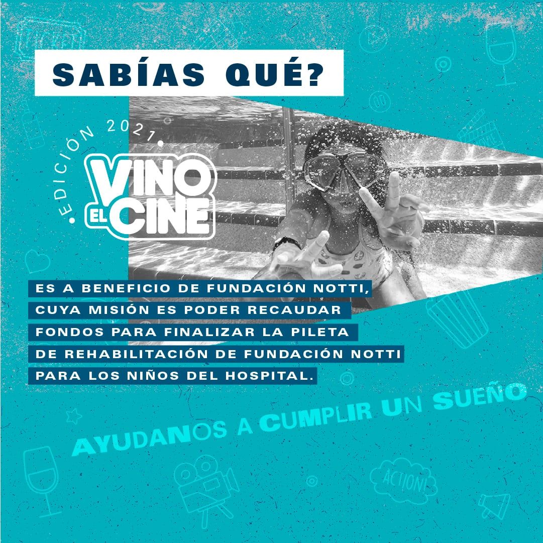 Esta acción, como siempre, tiene un fin solidario: Vino el Cine será a beneficio de Fundación Notti, cuya misión es recaudar fondos que serán destinados a la pileta de rehabilitación para los niños del Hospital Pediátrico Dr. Humberto Notti, y para continuar colaborando con las necesidades de los distintos servicios del Hospital en lo que respecta a equipamiento, capacitación de profesionales, ayuda a los pacientes y a sus familias. Además, para seguir adelante con las actividades deportivas, recreativas e inclusivas que actualmente se realizan en la Fundación.