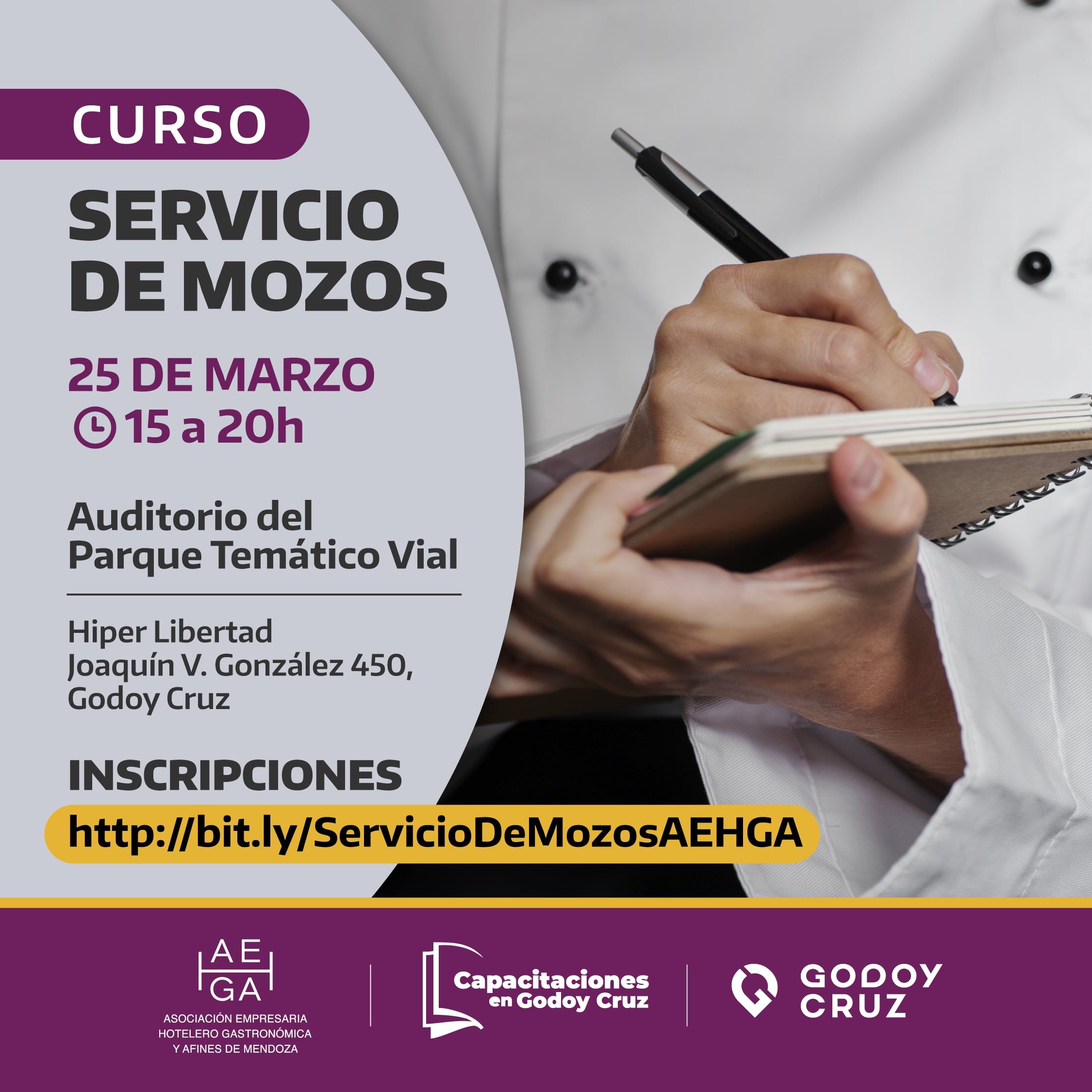 En el marco del trabajo articulado entre la Muni y AEHGA Mendoza (Asociación Empresaria Hotelero-Gastronómica y Afines), se dictará un Curso de Servicio de Mozos.