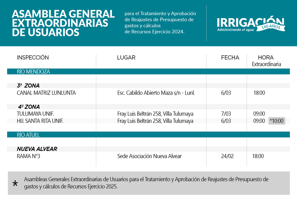 El tratamiento del aporte de los contribuyentes, en el esquema participativo que propone Irrigación, se apoya en las Inspecciones de Cauce que se distribuyen en todo el territorio provincial. Cada uno de estos organismos desarrollan asambleas periódicas donde los aportantes y usuarios tienen la oportunidad de decidir reunidos y democráticamente los pasos a seguir en este sentido. Por lo tanto, la participación de los usuarios es muy importante, ya que las Inspecciones de Cauce cuentan con su propio presupuesto surgido de una parte de la cuota que pagan los regantes con el canon anual de Irrigación.