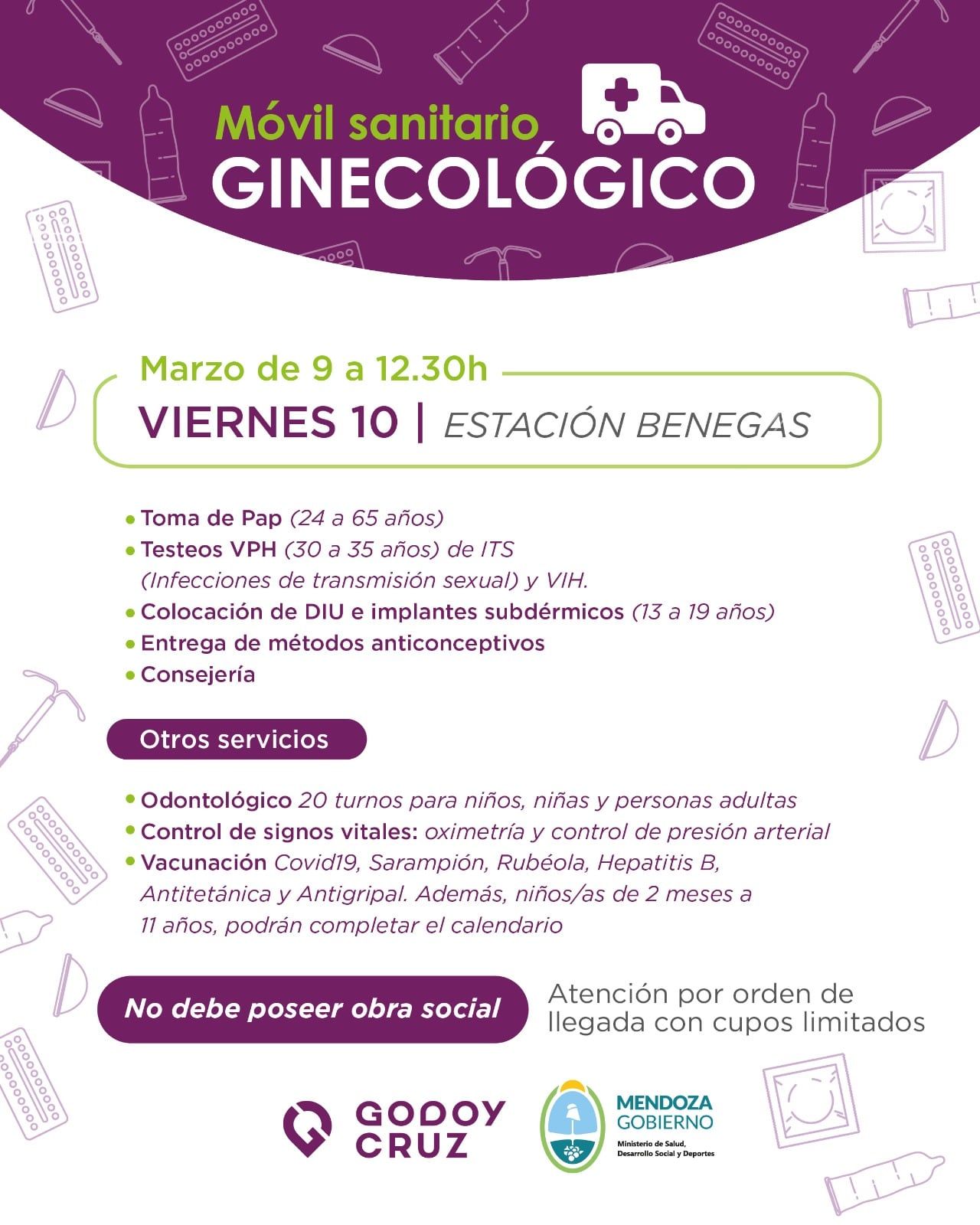 Se podrán realizar estudios de Papanicolau, para mayores de 24 a 65 años e implante de DIU, recomendado para mujeres con al menos un evento obstétrico. Mientras que el implante subdérmico está destinado para chicas de 13 a 19 años, y se recomienda retener la orina al menos por 3 horas. Los turnos se darán hasta las 10.