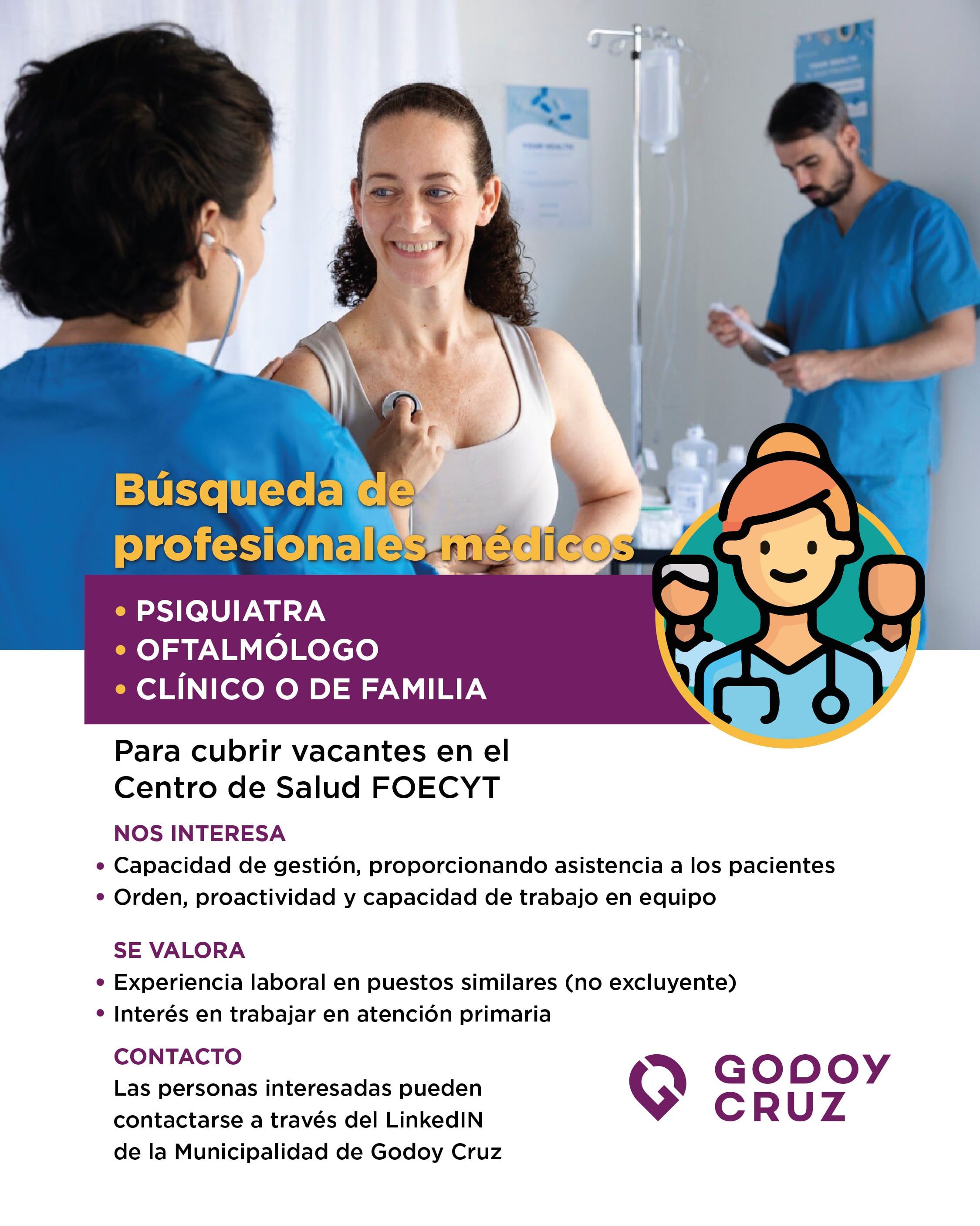 Godoy Cruz se encuentra en la búsqueda de profesionales médicos para cubrir vacantes en el Centro de Salud FOECYT. Es por eso que los requeridos son médicos clínicos o de familia, y en las especialidades de psiquiatría y oftalmología.