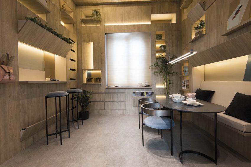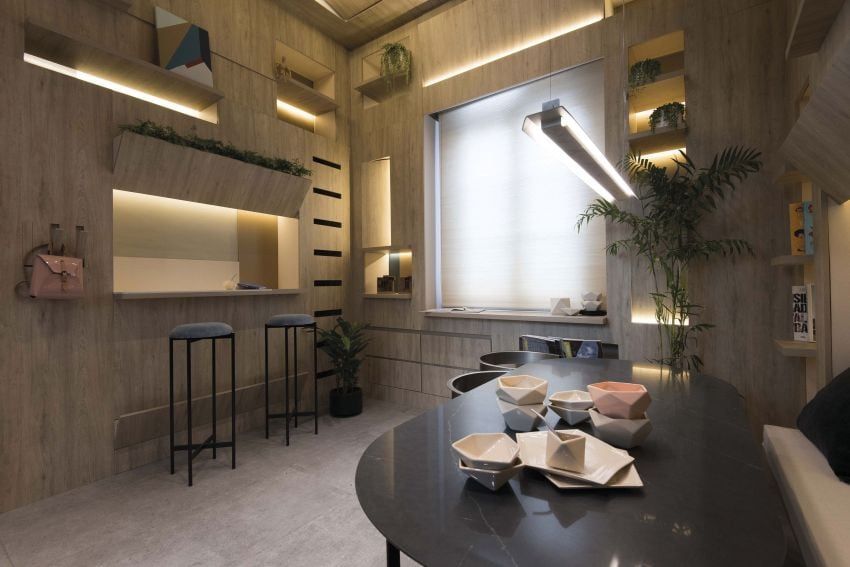Para darle el estilo, se planteó una envolvente constructiva tectónica (la técnica se basa en modulación aplicada repetida varias veces). El tono cálido acompaña al espacio de forma sutil, sin generar agobio.