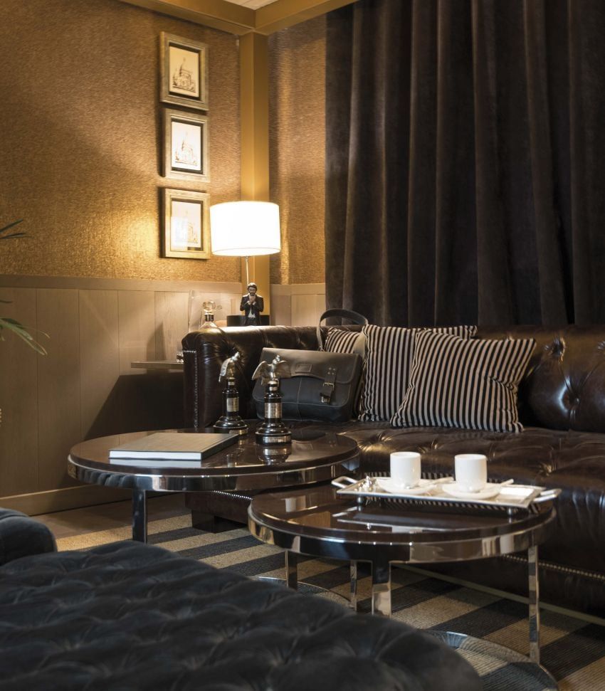 Los materiales elegidos tanto para revestir los muros como los tapizados, reflejan elegancia y sofisticación. Los géneros en cuero y terciopelo en tonos oscuros son predominantes en la elección.