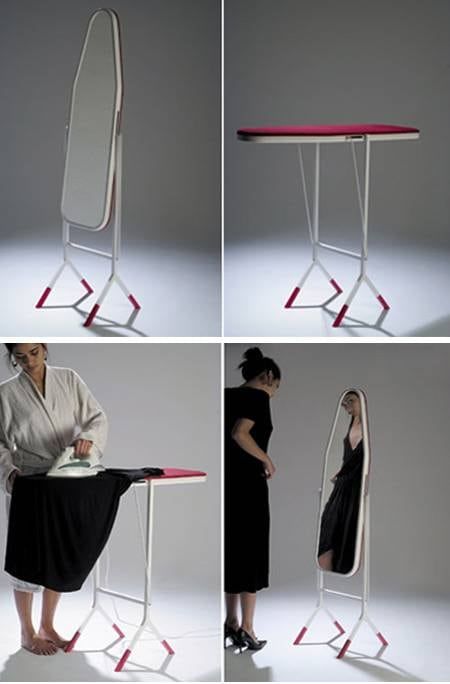 Un concepto interesante por el diseñador Aïssa Logerot, este espejo innovador se puede utilizar como tabla de planchar cuando se inclina y se fija en posición horizontal. Según el diseñador, "este objeto es un vínculo entre dos acciones consecutivas. Planchar la ropa y vestir".