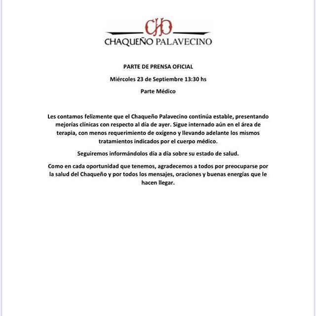 “Como en cada oportunidad que tenemos, agradecemos a todos por preocuparse por la salud del Chaqueño y por todos los mensajes, oraciones y buenas energías que le hacen llegar”, dice al final del comunicado publicado en la cuenta de Instagram del artista.