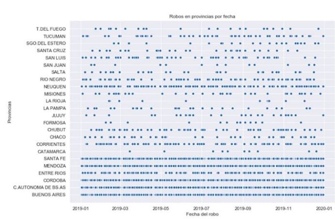 En detalle, la cantidad de robos por distrito se conforma de la siguiente manera: Buenos Aires (24501), CABA (5876), Córdoba (2598), Mendoza (1490), Santa Fe (1390), Neuquén (162), Entre Ríos (138), Corrientes (104), Río Negro (91), Chubut (71), Tucumán (60), San Luis (59), Chaco (41), Misiones (40), Salta (32), Santa Cruz (30), Jujuy (28), La Pampa (28), Santiago del Estero (27), Tierra del Fuego (24), San Juan (14), Formosa (14), La Rioja (13) y Catamarca (11).