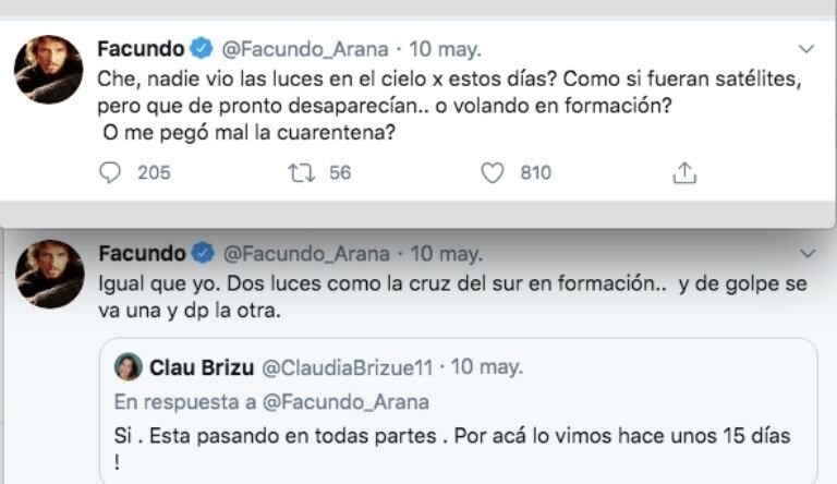 Sin dudarlo sus seguidores le contestaron: “Está pasando en todas partes. Por acá lo vimos hace unos 15 días". Facundo siguió el hilo: “Igual que yo. Dos luces como la Cruz del Sur en formación y de golpe se va una y después la otra”. ¿Qué será?