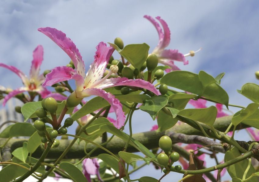 No podía faltar este maravilloso árbol de flores rosadas, tronco engrosado en su base como “botella” y espinas cónicas. Florece en nuestra latitud a finales del verano y principio de otoño. La especie “Ceiba chodatii” tiene flores blancas y “C. insignis” flores amarillas. Existen otras más con flores de tonalidades intermedias, pero no tienen gran difusión en el paisajismo. Los frutos de estas plantas tienen una fibra similar a la del algodón que se emplea para rellenar, por ejemplo: almohadones.