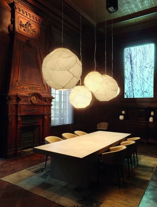 Sobre el centro de la mesa cuelgan lámparas en forma circular con texturas irregulares.