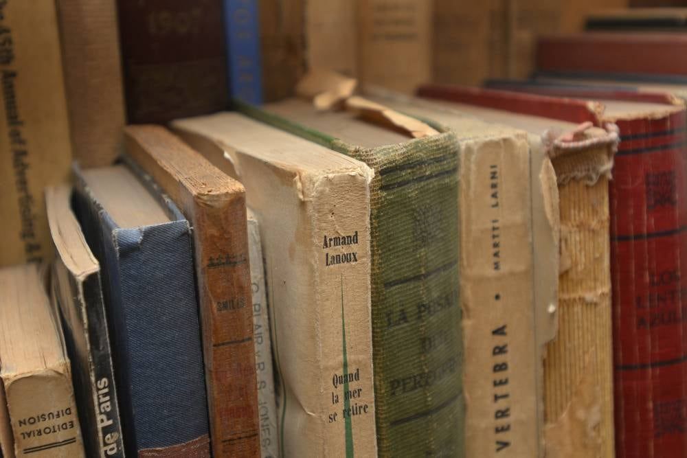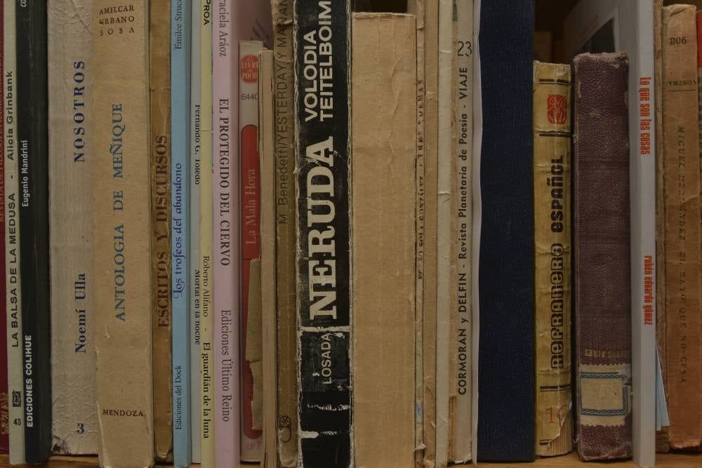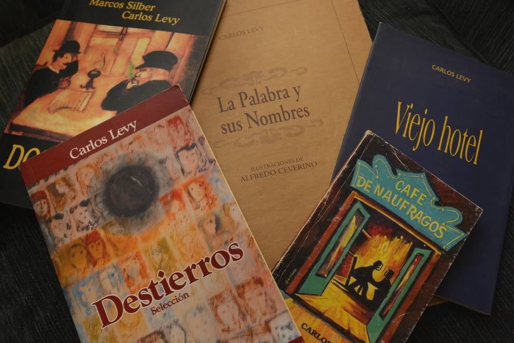 Los Libros Levy no recuerda el número exacto de libros que lleva publicados, pero nos junta algunos para la foto: "Café de náufragos" (1992), "La palabra y sus nombres" (1998), "Destierros" (2000), "Viejo hotel" (2008) y "Doloratas", obra conjunta de él y de Marcos Silber (2001).