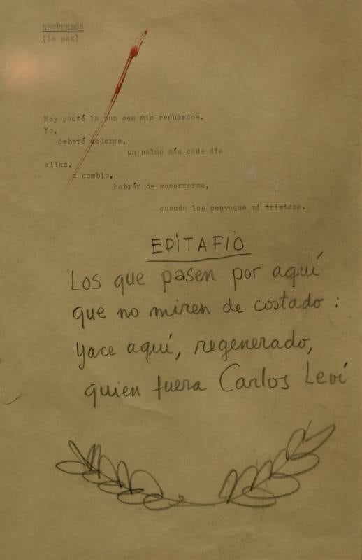 Anverso y Reverso: detrás del retrato que le regaló su amigo Ricardo Embrioni, se lee un epitafio para él mismo, escrito por Fernando Lorenzo: "Los que pasen por aquí / que no miren de costado / yace aquí, regenerado, / quien fuera Carlos Levy".