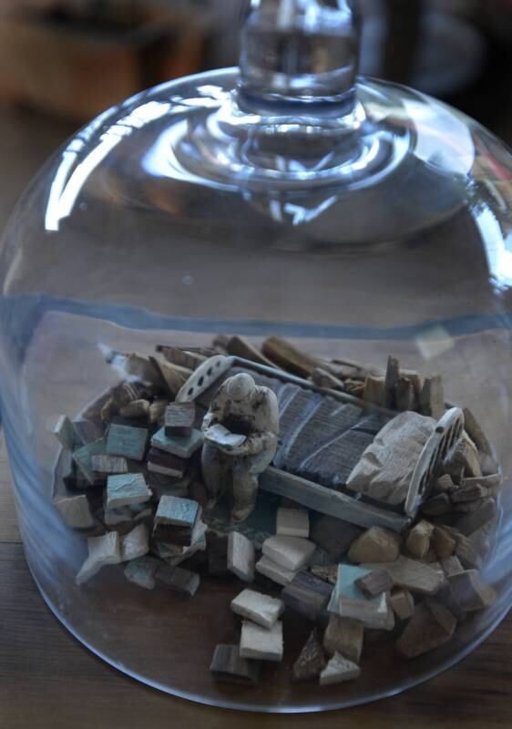 “Importa la imagen, la idea, no importa el material”, sostiene el escultor. Una serie en miniatura hecha en madera, cubierta por una estructura de vidrio.