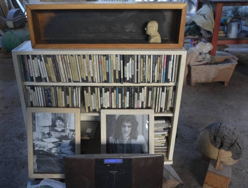 Entre el polvo y la madera, el rock nacional e internacional tiene su lugar de privilegio. Para acompañar el trabajo, una buena colección de discos reposa en un mueble, junto a su equipo de música.