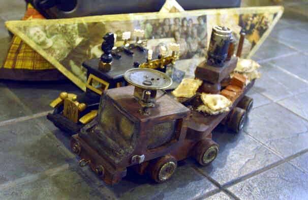 Juguetes para reflexionar. Entre sus objetos de trabajo, dos juguetes restaurados por Laura Calligiuri. El tránsito fue largo; originales de Bolivia, luego se sumaron a un relato teatral desde lo lúdico.