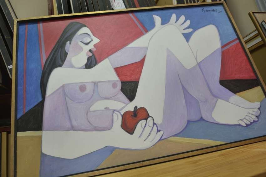 "Modelo con manzana" (2012) es uno de sus cuadros favoritos. "Todo el blanco de la pintura es de la tela. Ahí no hay pintura. La elección del color en mis obras depende del tema. Uno le va buscando la forma a un color determinado. Si el color le cae bien, voy por ese camino. En esta pintura todos son planos, lo más figurativo es el rostro", dice.