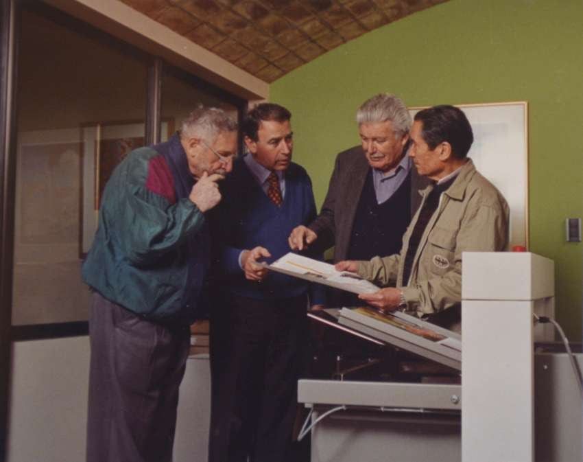 Una fotografía de Bermúdez en Zeta Editores. Revisa la impresión de su libro, junto a Luis Quesada, Marcelo Santángelo y Homero Pineda, director de la editorial. Artistas que marcaron una época en Mendoza y fueron grandes amigos.