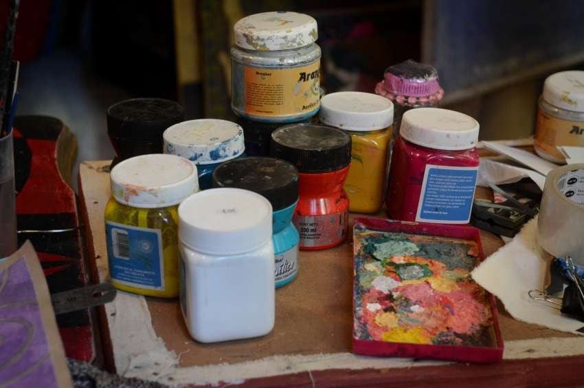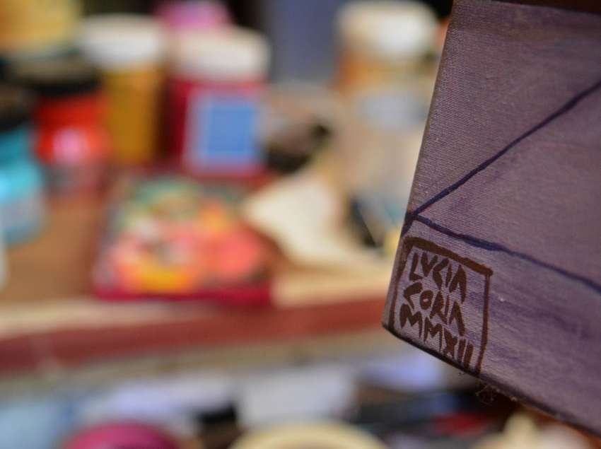 Si bien trabaja sobre lienzo con acrílicos, en sus inicios incursionó con otros materiales como el óleo, hasta que por una alergia al aguarrás decidió dejarlos. “Cambió el material y cambió la técnica”, asume. Lucía suele intervenir sus pinturas con bordados, plumas y otros elementos.