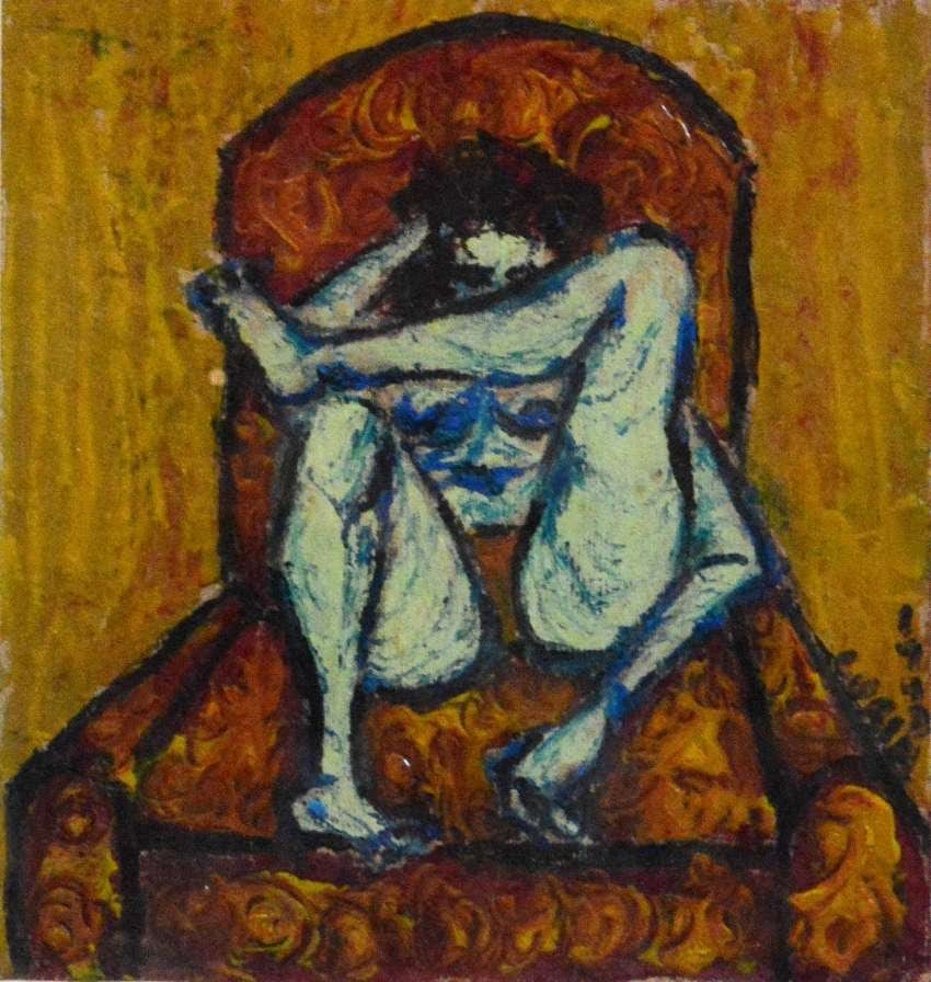 A principios de la década del 90, Lucía ya sabía que su misión en el arte era hablar de experiencias de mujeres. Ya entonces tematizó la violencia de género, como en este pequeño cuadro de tinta de litografía sobre papel, pintado con palos en lugar de pinceles para transmitir tosquedad y dureza.